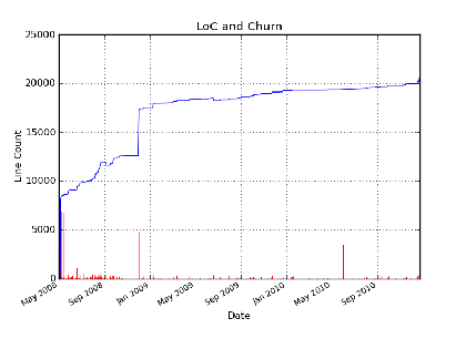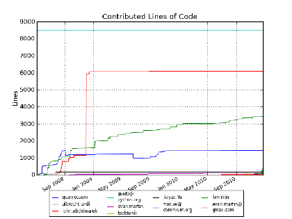 Lines of Code (Contributed by different Authors) Contributed lines of code is good way to get a 'feel' of different authors contributions overtime. But remember that LoC is not a good way of measuring a contribution. So if you want to use SVNPlot , donot use this as input for appraisals :-) |