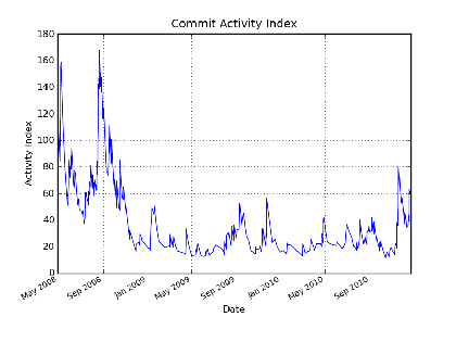 | The size of Author name represents number of commits by author. Color of author name represents the 'activity temperature'. Recent activity gives 'redder' color. If there are no recent activity color slow goes to 'blue'. This representation gives an idea about who are recent contributors and who contributed big chunks